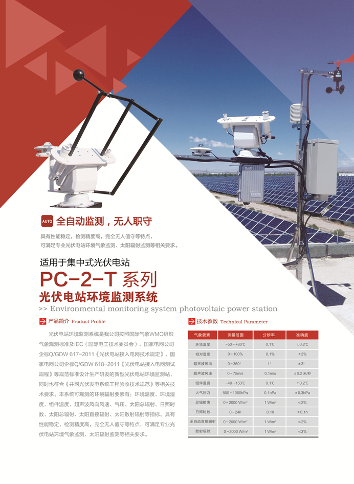 PC-2-T2型光伏電站環(huán)境監(jiān)測系統(tǒng),該系統(tǒng)具有性能穩(wěn)定,檢測精度高,完全無人值守等特點(diǎn),可完全滿足調(diào)度對(duì)光伏電站氣象數(shù)據(jù)和太陽輻射數(shù)據(jù)的考核要求。