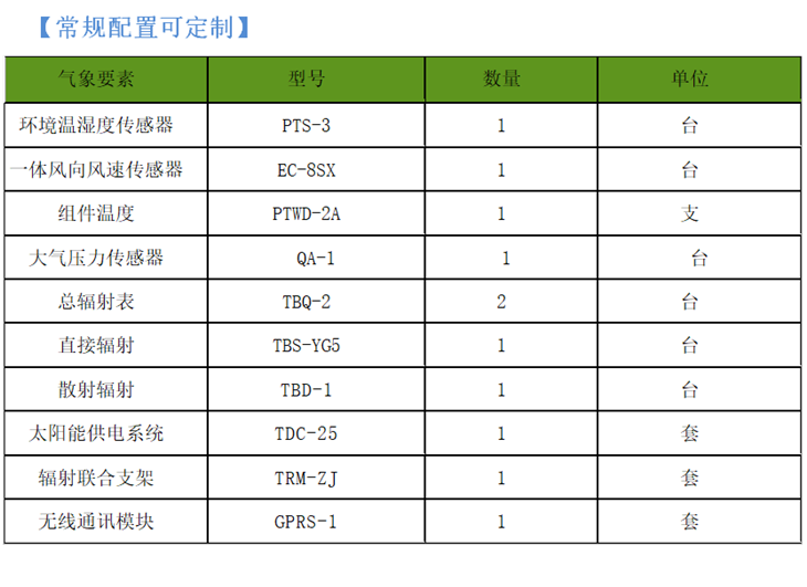 這套系統(tǒng)可觀測的環(huán)境輻射要素有:環(huán)境溫度、環(huán)境濕度、組件溫度、風(fēng)速、風(fēng)向、氣壓、太陽總輻射、日照時數(shù)、太陽總輻射、太陽直接輻射、太陽散射輻射等指標(biāo)。具有性能穩(wěn)定,檢測精度高,完全無人值守等特點(diǎn),可滿足專業(yè)光伏電站環(huán)境氣象監(jiān)測、太陽輻射監(jiān)測等相關(guān)要求。