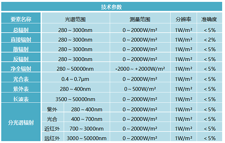 太陽輻射是氣象觀測指標(biāo)中重要內(nèi)容,根據(jù)氣象組織WMO標(biāo)準(zhǔn)要求,太陽輻射標(biāo)準(zhǔn)觀測分為:總輻射、散射輻射、直接輻射、反射輻射、凈全輻射,太陽光譜輻射(紫外光、可見光,近紅外光,遠(yuǎn)紅外光)