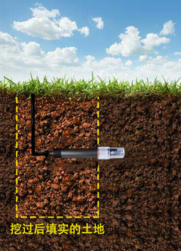 垂直挖直徑>20cm的坑,按照測量需要,在既定的深度將傳感器水平插入坑壁,將坑填埋嚴實,穩(wěn)定一段時間后,即可進行連續(xù)數天,數月乃至更長時間的測量和記錄。