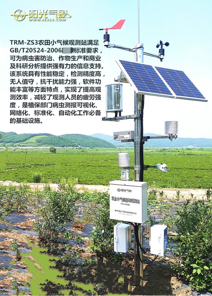 TRM-ZS3農(nóng)田小氣候觀測站滿足GB/T 20524-2006標準要求,可為病蟲害防治、作物生產(chǎn)和商業(yè)及科研分析提供強有力的信息支持。該系統(tǒng)具有性能穩(wěn)定,檢測精度高,無人職守,抗干擾能力強,軟件功能豐富等方面特點,實現(xiàn)了提高觀測效率,減輕觀測人員的勞動強度,是植保部門病蟲測報可視化、網(wǎng)絡(luò)化、標準化、自動化工作必備的基礎(chǔ)設(shè)施。