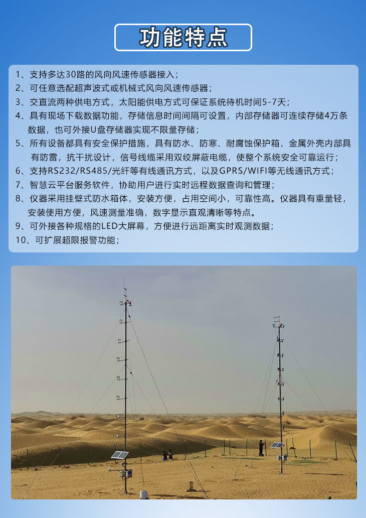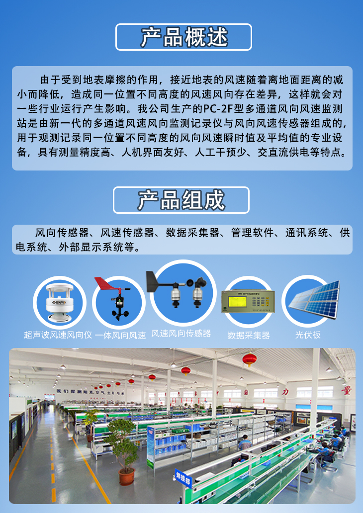 由于受到地表摩擦的作用,接近地表的風(fēng)速隨著離地面距離的減小而降低,造成同一位置不同高度的風(fēng)速風(fēng)向存在差異,這樣就會對一些行業(yè)運(yùn)行產(chǎn)生影響。我公司生產(chǎn)的PC-2F型多通道風(fēng)向風(fēng)速監(jiān)測站是由新一代的多通道風(fēng)速風(fēng)向監(jiān)測記錄儀與風(fēng)向風(fēng)速傳感器組成的,用于觀測記錄同一位置不同高度的風(fēng)向風(fēng)速瞬時值及平均值的專業(yè)設(shè)備,具有測量精度高、人機(jī)界面友好、人工干預(yù)少、交直流供電等特點。