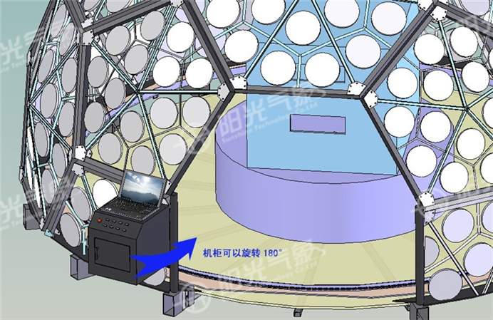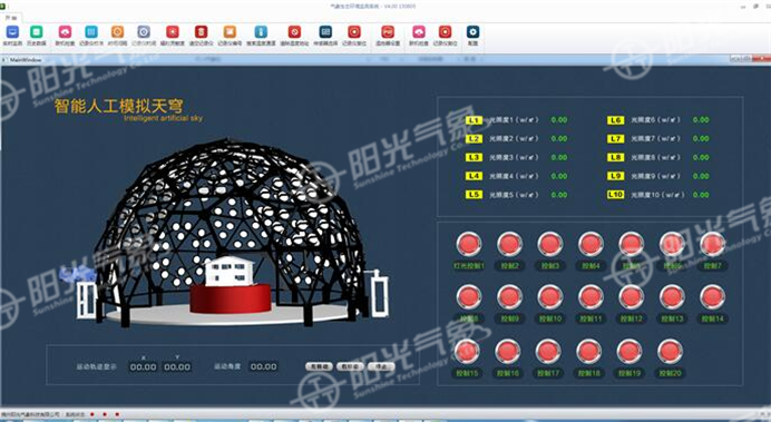 2、模擬太陽實(shí)時軌跡,通過計算機(jī)軟件控制,實(shí)現(xiàn)太陽高度角及方位角的自動定位,從而實(shí)現(xiàn)了太陽實(shí)時模擬。