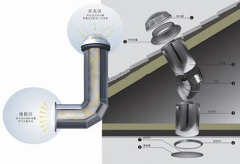 作為一種無電照明系統(tǒng),導(dǎo)光管照明系統(tǒng)是通過室外的采光裝置捕獲室外的日光,并將其導(dǎo)入系統(tǒng)內(nèi)部,然后經(jīng)過導(dǎo)光管裝置強化并高效傳輸后,由漫射器將自然光均勻?qū)胧覂?nèi)需要光線的任何地方。從黎明到黃昏,甚至是陰天或雨天,該照明系統(tǒng)導(dǎo)入室內(nèi)的光線仍然十分充足。該裝置主要由三部分組成:室外屋頂?shù)牟晒庋b置、導(dǎo)光管傳輸部分、室內(nèi)頂部的漫射器。
