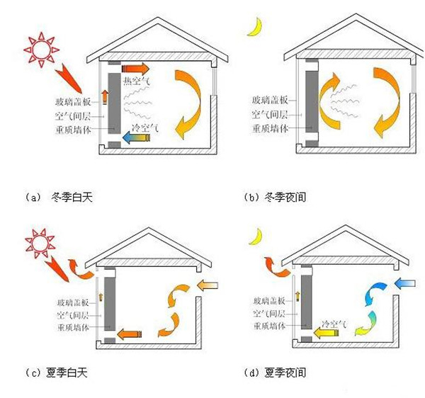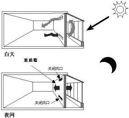 特朗伯集熱墻是一種依靠墻體獨特的構(gòu)造設(shè)計,無機械動力、無傳統(tǒng)能源消耗、僅僅依靠被動式收集太陽能為建筑供暖的集熱墻體。它由法國太陽能實驗室主任FelixTrombe教授及其合作者首先提出并實驗成功的,故通稱為Trombewall(特朗伯墻)。特朗伯墻在冬、夏兩季以及白天、夜晚的工作運行原理及要求均有所差別。