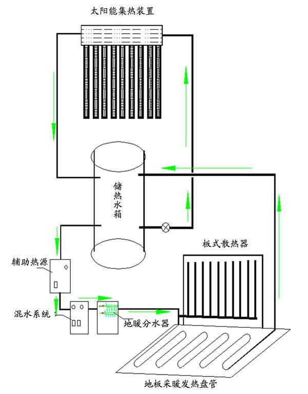太陽能集熱器采集太陽的能量,把冷水逐漸加熱,儲存在保溫水箱內(nèi),待需要取暖時開啟加以利用,把水箱內(nèi)儲存的熱能通過地暖管路內(nèi)熱水的循環(huán)對室內(nèi)空間進行釋放熱能,將室內(nèi)的冷空氣加熱,來提高室內(nèi)空間的環(huán)境溫度。滿足需要。太陽能采暖系統(tǒng)由太陽能集熱器(平板太陽能集熱器、真空管太陽能集熱器、U型管太陽能集熱器、熱管太陽能集熱器)、水箱、連接管道、控制系統(tǒng)等輔材構(gòu)成。將分散的太陽能通過集熱器,把太陽能轉(zhuǎn)換成熱水,將熱水儲存在水箱內(nèi),然后通過熱水輸送到地暖管路,提供建筑供熱的需求。