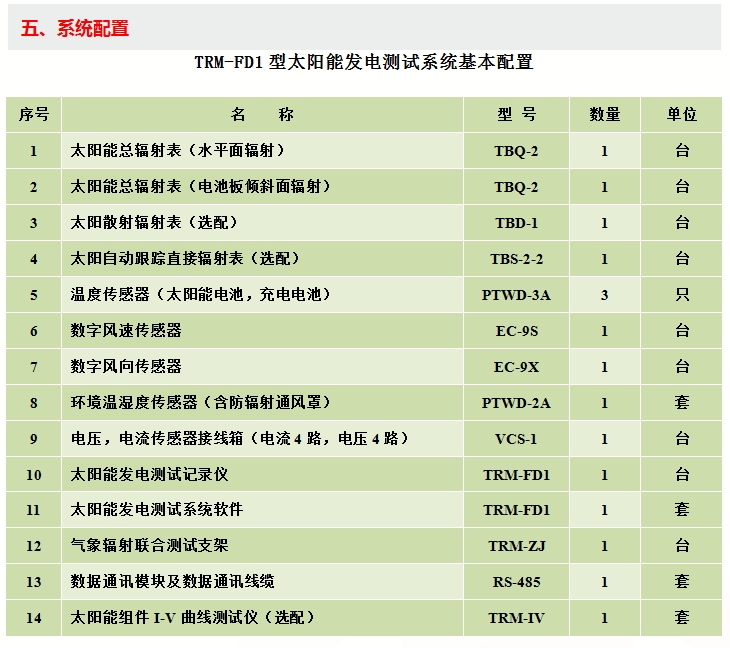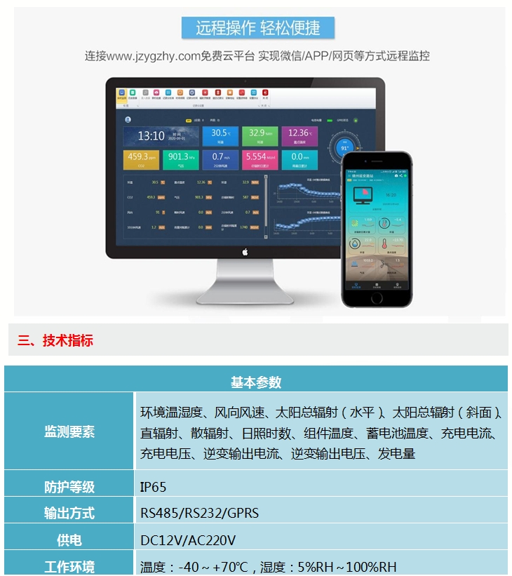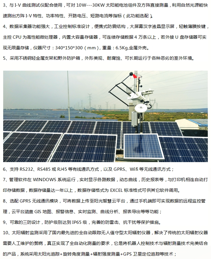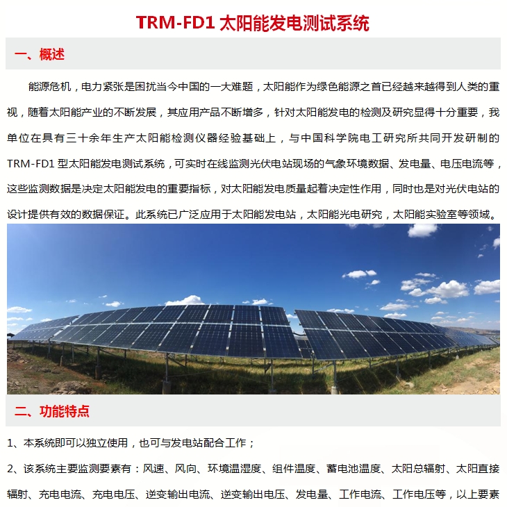 TRM-FD1型太陽能發(fā)電測試系統(tǒng),可實時在線監(jiān)測光伏電站現(xiàn)場的氣象環(huán)境數(shù)據(jù)、發(fā)電量、電壓電流等,這些監(jiān)測數(shù)據(jù)是決定太陽能發(fā)電的重要指標,對太陽能發(fā)電質量起著決定性作用,同時也是對光伏電站的設計提供有效的數(shù)據(jù)保證。