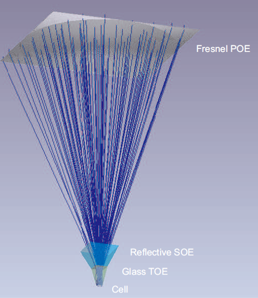 聚光光路設(shè)計(jì)中,入射光通過三級(jí)聚光部件進(jìn)行聚光。其中初級(jí)光學(xué)器件(菲涅爾非成像玻璃透鏡)裝配到組件框架結(jié)構(gòu)上,二三級(jí)光學(xué)器件裝配到聚光接收器模塊上。這種設(shè)計(jì)將入射接收角提高至±0.86°,同時(shí)提高光線均勻度。有效的提高了功率和效率。該光學(xué)器件及光路解決方案由德國(guó)知名光學(xué)設(shè)計(jì)公司提供。