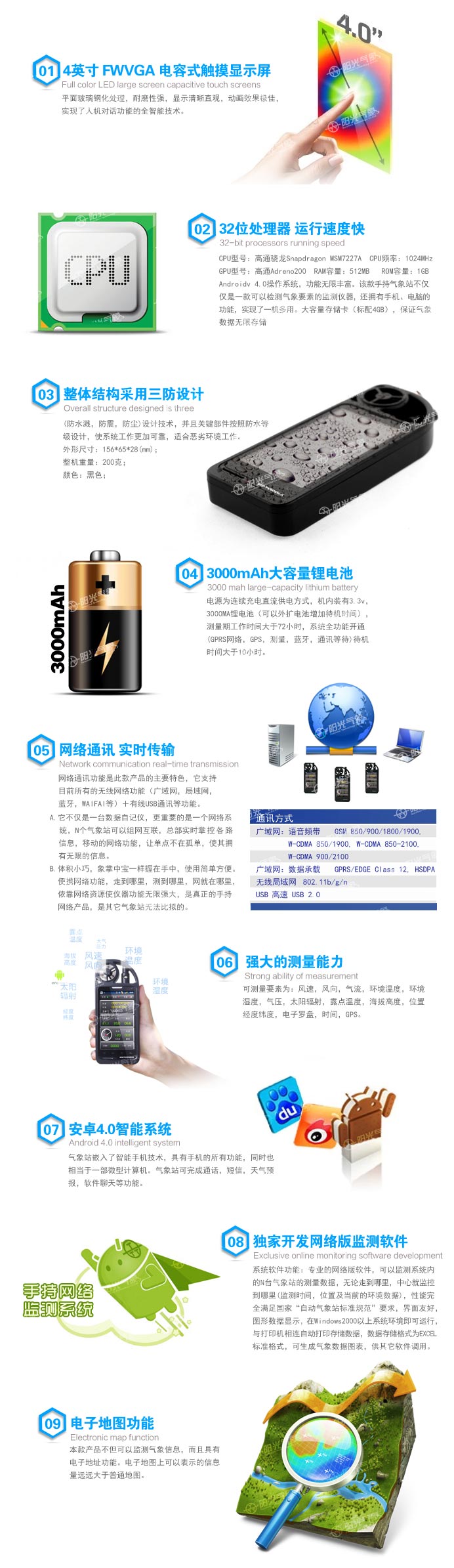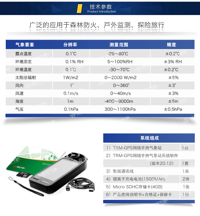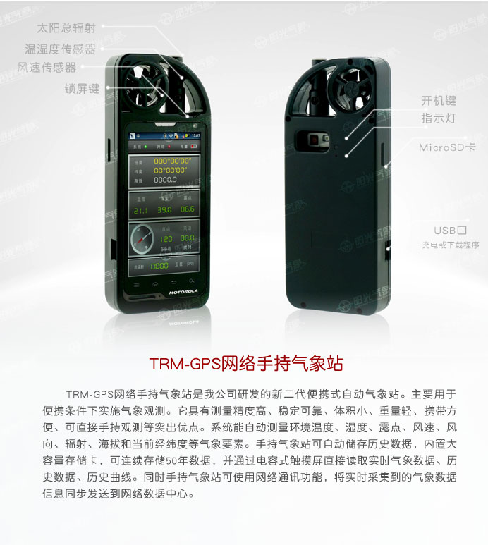 手持氣象站是我公司研發(fā)的新二代便攜式自動氣象站。主要用于便攜條件下實施氣象觀測。它具有測量精度高、穩(wěn)定可靠、體積小、重量輕、攜帶方便、可直接手持觀測等突出優(yōu)點。系統(tǒng)能自動測量環(huán)境溫度、濕度、露點、風速、風向、輻射、海拔和當前經緯度等氣象要素。手持氣象站可自動儲存歷史數(shù)據(jù),內置大容量存儲卡,可連續(xù)存儲50年數(shù)據(jù),并通過電容式觸摸屏直接讀取實時氣象數(shù)據(jù)、歷史數(shù)據(jù)、歷史曲線。同時手持氣象站可使用網絡通訊功能,將實時采集到的氣象數(shù)據(jù)信息同步發(fā)送到網絡數(shù)據(jù)中心。