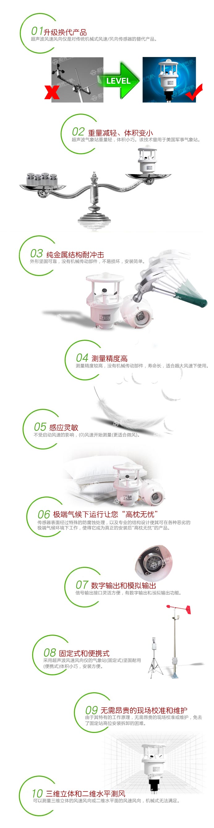 氣象站采用超聲波探頭來測量風速和風向,沒有任何移動部件,儀器結(jié)構(gòu)緊湊,更加耐用,數(shù)據(jù)更加可靠。也可用內(nèi)置的溫度、濕度和氣壓傳感器等傳感器探頭監(jiān)測相關(guān)氣候指標。精確的測量數(shù)據(jù)可以幫助氣象、水利、交通及科研等組織提供精確的數(shù)據(jù)依據(jù)及判斷條件。
