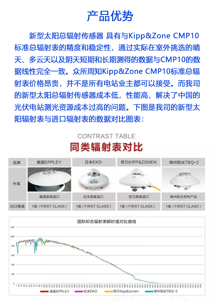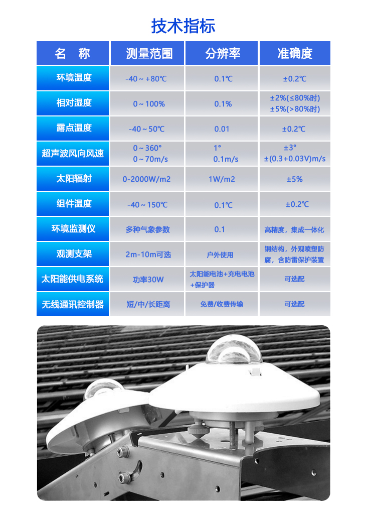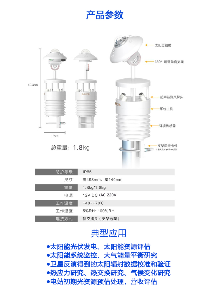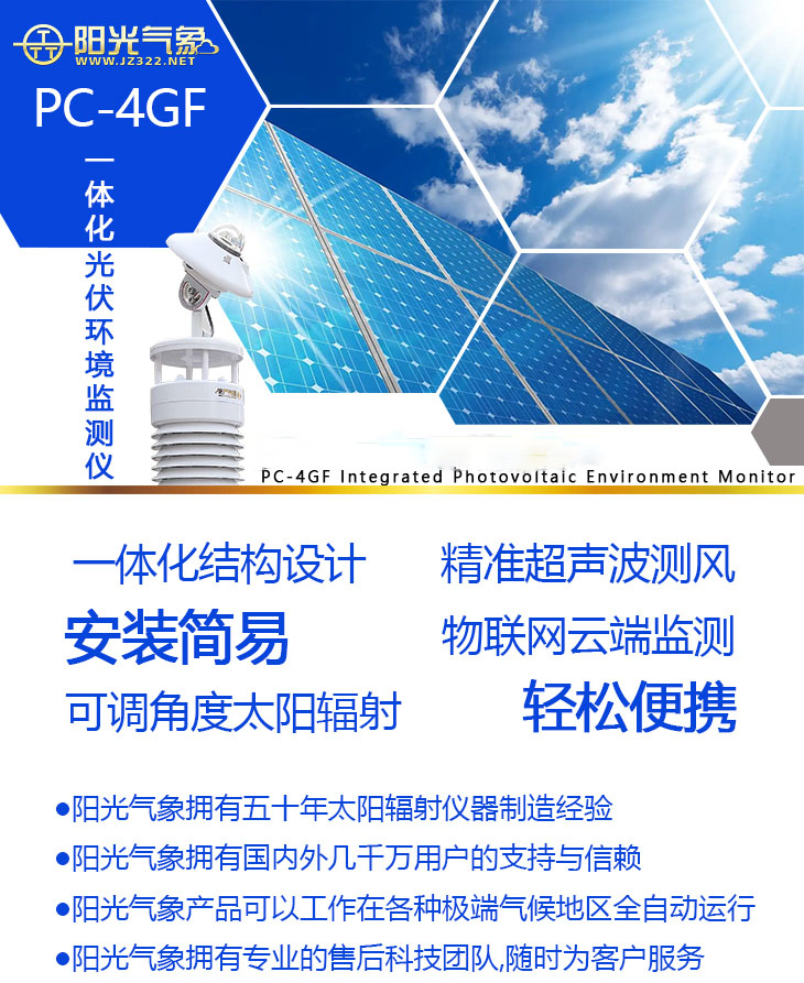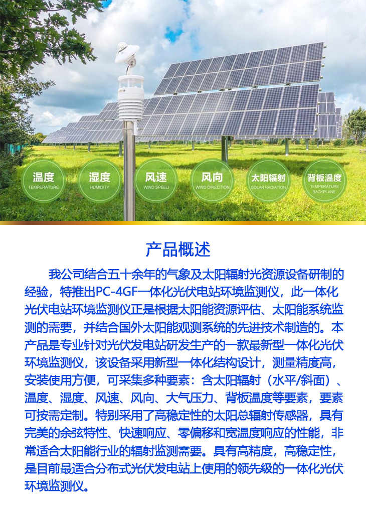 本產(chǎn)品是針對(duì)光伏發(fā)電站研發(fā)生產(chǎn)的一款最新型一體化光伏環(huán)境監(jiān)測(cè)儀,該設(shè)備采用新型一體化結(jié)構(gòu)設(shè)計(jì),測(cè)量精度高,安裝使用方便,可采集多種要素:含太陽(yáng)輻射(水平/斜面)、溫度、濕度、風(fēng)速、風(fēng)向、大氣壓力、背板溫度等要素,要素可按需定制。