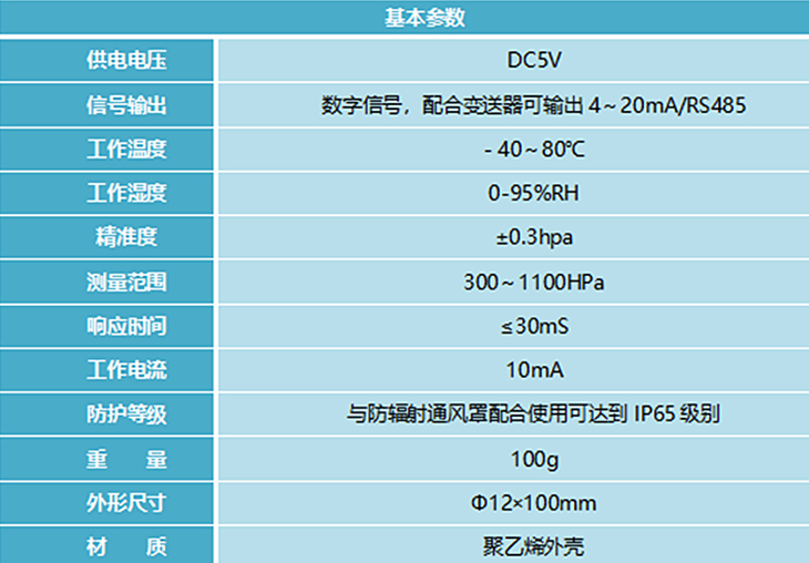 氣壓是作用在單位面積上的大氣壓力,即等于單位面積上向上延伸到大氣上界的垂直空氣柱的重量。氣象上使用的所有氣壓表的刻度均應(yīng)以hPa分度。在標(biāo)準(zhǔn)條件下,760mmHg的氣壓等于1032.25hPa。 QA-1型氣壓傳感器采用國外壓阻式傳感器芯片封裝,經(jīng)精密溫度補償,具有高精度﹑高靈敏度的特點??蓱?yīng)用于空氣壓力,海拔高度的測量是自動氣象站的配套產(chǎn)品。