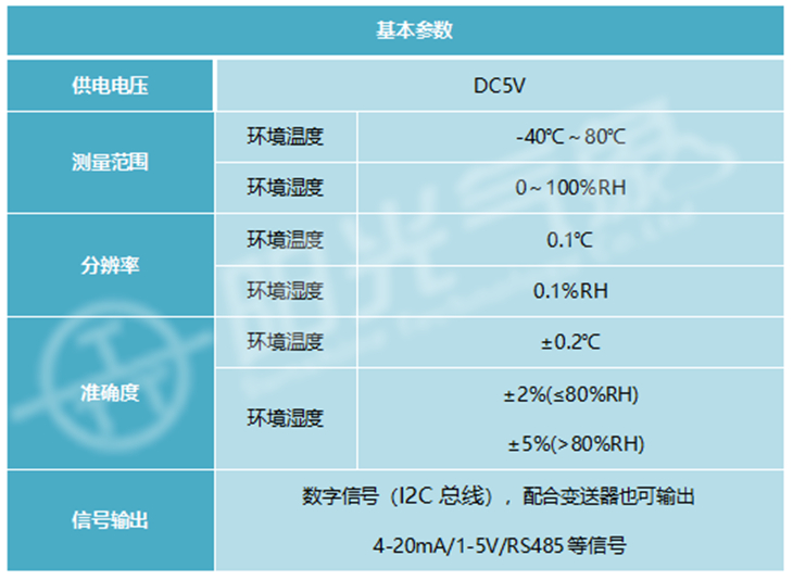4、數(shù)字信號輸出,I2C總線與微控制器進(jìn)行通信,能輸出數(shù)字式溫濕度數(shù)據(jù)。