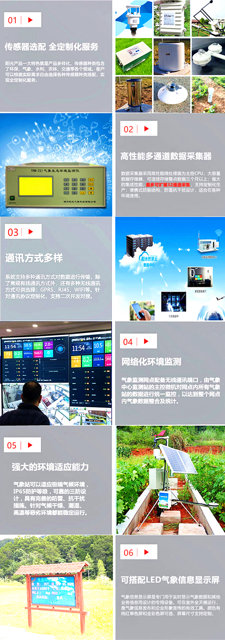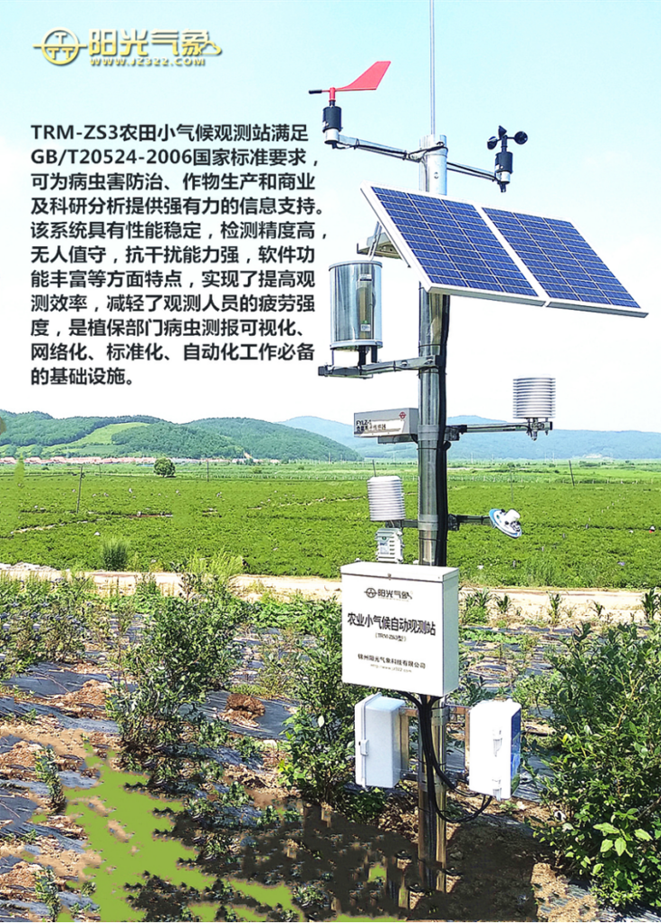 TRM-ZS3農(nóng)田小氣候觀測站滿足GB/T 20524-2006國家標準要求,可為病蟲害防治、作物生產(chǎn)和商業(yè)及科研分析提供強有力的信息支持。該系統(tǒng)具有性能穩(wěn)定,檢測精度高,無人職守,抗干擾能力強,軟件功能豐富等方面特點。