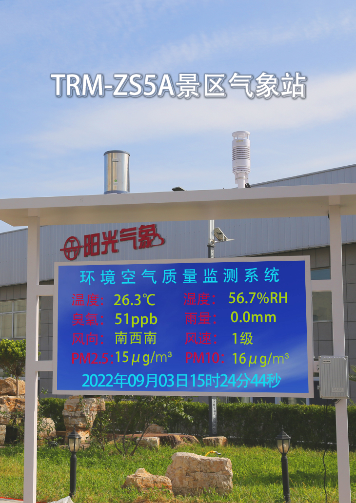 TRM-ZS5A型景區(qū)氣象站,又稱為景區(qū)氣象監(jiān)測(cè)站,是專門針對(duì)景區(qū)氣象環(huán)境特點(diǎn)而研發(fā)和設(shè)計(jì)的一款自動(dòng)化的氣象設(shè)備,外形美觀、安裝簡(jiǎn)單,可以根據(jù)不同地區(qū)的氣候特性選擇不同的監(jiān)測(cè)要素,支持多種傳輸方式,系統(tǒng)由一體化氣象站和彩色LED大屏幕組成,系統(tǒng)可將采集的數(shù)據(jù)實(shí)時(shí)顯示在大屏幕上,也可以通過(guò)GPRS/WIFI網(wǎng)絡(luò)傳輸至云平臺(tái)供客戶下載查看。
