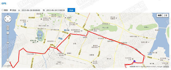 用戶可在平臺上通過在線電子地圖(Google Map、Baidu地圖等)總體瀏覽用戶所有設備的地理位置,查看某位置設備的詳細信息。在電子地圖上也可以通過縮放地圖,更加細致地瀏覽設備。用戶也可在平臺上直接查看GPS類型的傳感器數(shù)據(jù),將每個數(shù)據(jù)點用直線連接,繪制成一條運動路徑。如下圖所示: