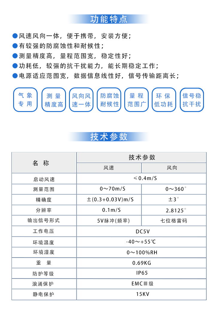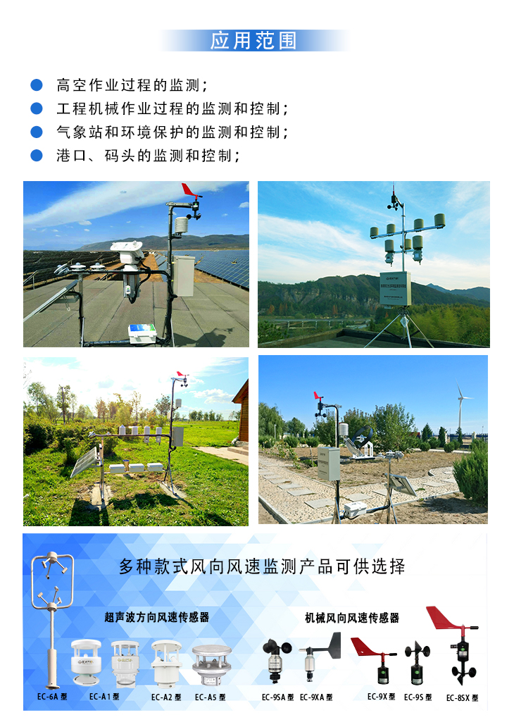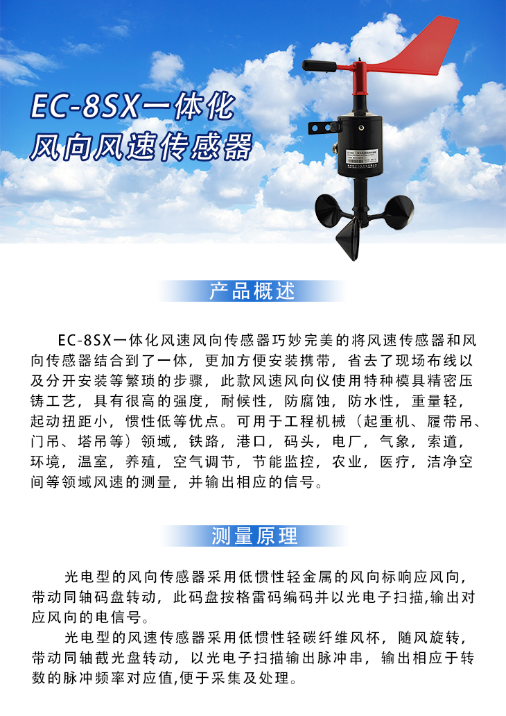 EC-8SX一體化風(fēng)速風(fēng)向傳感器巧妙完美的將風(fēng)速傳感器和風(fēng)向傳感器結(jié)合到了一體,更加方便安裝攜帶,省去了現(xiàn)場布線以及分開安裝等繁瑣的步驟,此款風(fēng)速風(fēng)向儀使用特種模具精密壓鑄工藝,具有很高的強(qiáng)度,耐候性,防腐蝕,防水性,重量輕,起動扭距小,慣性低等優(yōu)點(diǎn)??捎糜诠こ虣C(jī)械(起重機(jī)、履帶吊、門吊、塔吊等)領(lǐng)域,鐵路,港口,碼頭,電廠,氣象,索道,環(huán)境,溫室,養(yǎng)殖,空氣調(diào)節(jié),節(jié)能監(jiān)控,農(nóng)業(yè),醫(yī)療,潔凈空間等領(lǐng)域風(fēng)速的測量,并輸出相應(yīng)的信號。