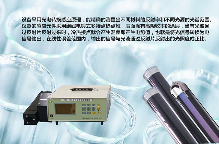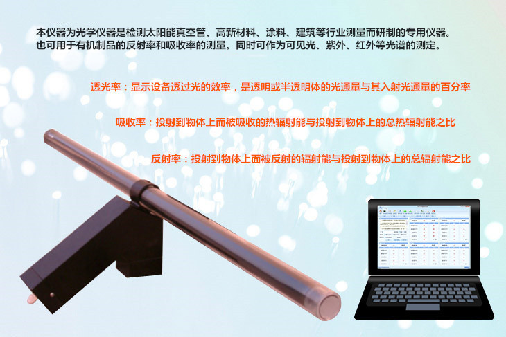 本儀器為光學儀器是檢測太陽能真空管,太陽能集熱器及高新材料、涂料、顏料、建筑等行業(yè)精確測量而研制的專用儀器,它可用于各種太陽能真空管,太陽能集熱器涂層、漆膜、油脂、簿膜、塑料制品、有機制品反射率和吸收率的測量。