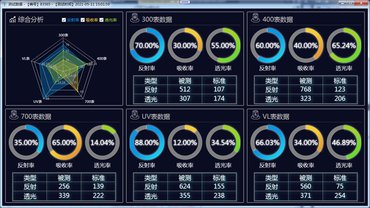 4.檢測數(shù)據(jù)自動存儲,實時顯示測試結果,自動計算并繪制反射率,吸收率,透光率曲線圖。
