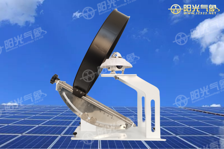 本裝置設有寬度為65mm,直徑為400mm的遮光環(huán)圈,固定在刻有緯度刻度與赤緯刻度標尺的絲桿調整螺旋上。標尺與支架固定在底盤上,根據架射地點的地理緯度而固定。總輻射表安裝在支架平臺上,其高度應正好使輻射感應平面(黑體)位于遮光環(huán)中心。通過調節(jié)赤緯度,可使遮光環(huán)全天遮住太陽的直接輻射。