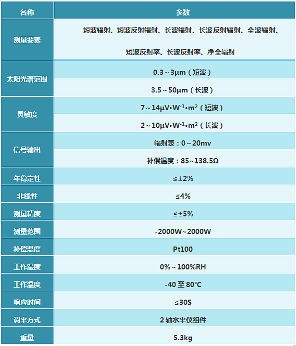 每只輻射表都分別有各自的靈敏度系數(shù)和輸出導(dǎo)線,可單獨(dú)輸出各個數(shù)據(jù),同時通過各自的輸出數(shù)據(jù)進(jìn)行組合,分別能測量短波輻射、短波反射輻射、長波輻射、長波反射輻射、全波輻射、凈全輻射、短波反射率和長波反射率。