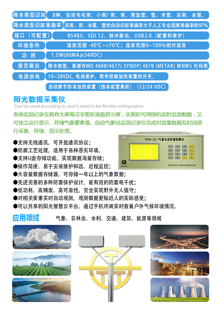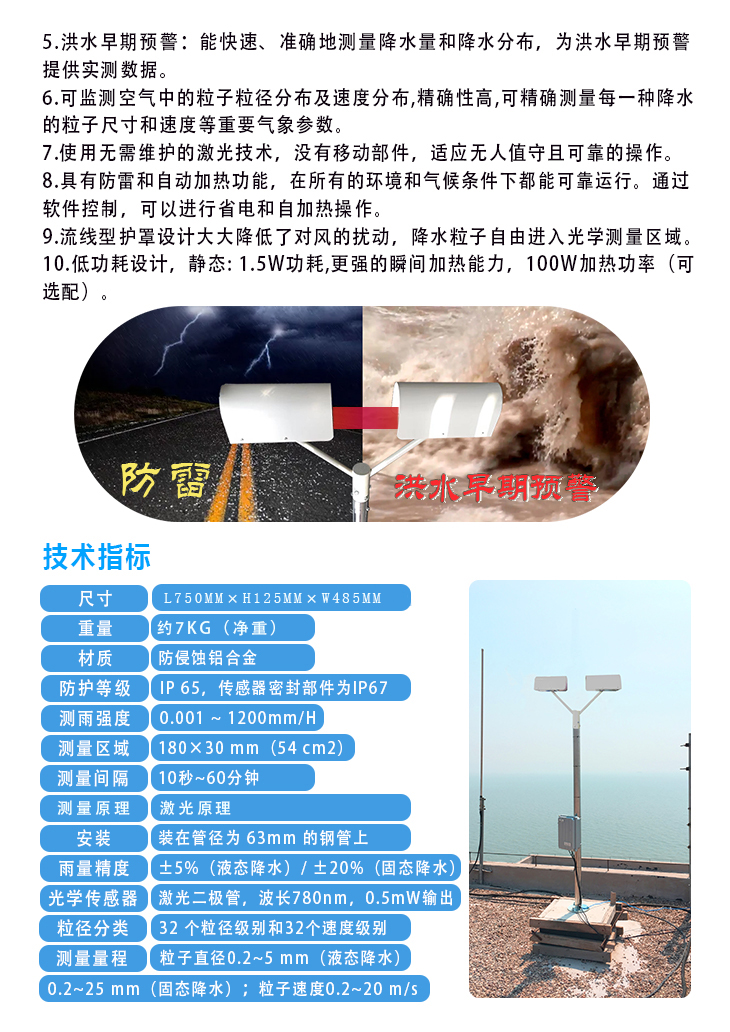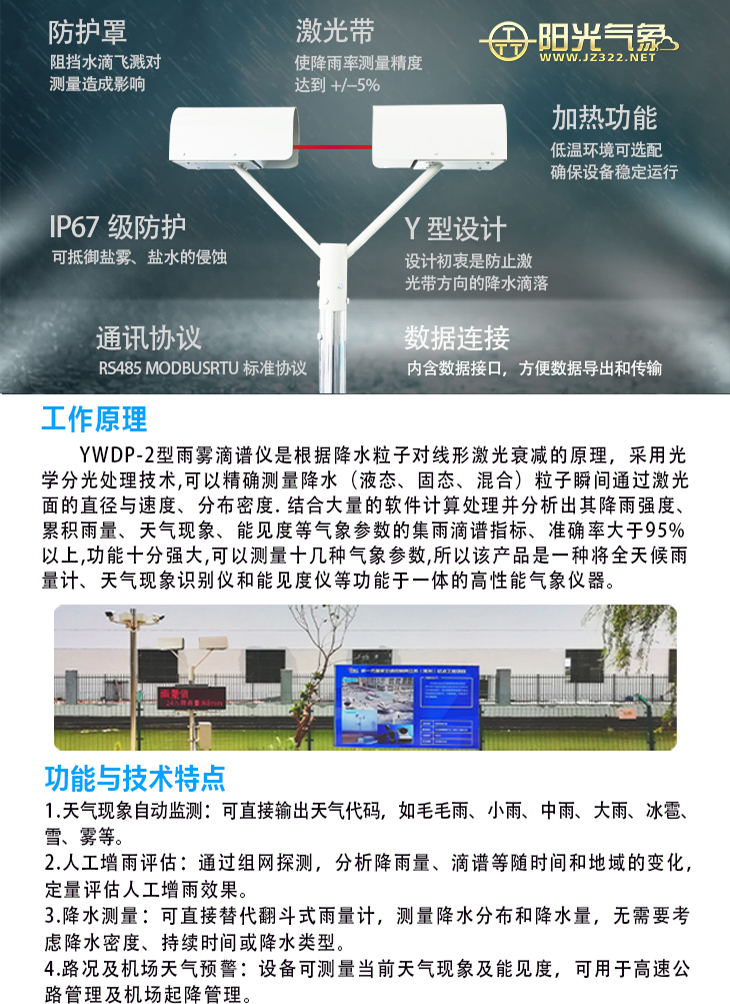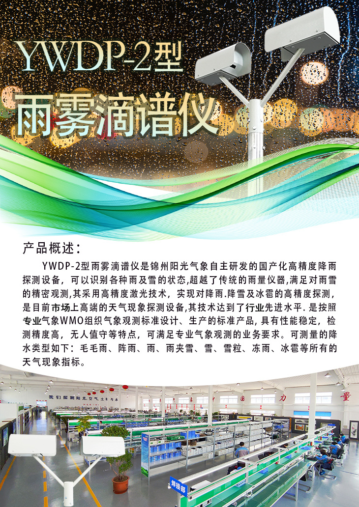 YWDP-2型天氣現(xiàn)象儀是錦州陽光自主研發(fā)的國產(chǎn)化高精降雨探測設(shè)備,可以識別各種雨及雪的狀態(tài),滿足對雨雪的精密觀測,其采用高精度激光技術(shù),實現(xiàn)對降雨.降雪及冰雹的高精度探測。產(chǎn)品按照國際氣象WMO組織氣象觀測標準設(shè)計、生產(chǎn)的標準產(chǎn)品, 具有性能穩(wěn)定,檢測精度高,無人值守等特點,可滿足專業(yè)氣象觀測的業(yè)務(wù)要求??蓽y量的降水類型如下:毛毛雨、陣雨、雨、雨夾雪、雪、雪粒、凍雨、冰雹等所有的天氣現(xiàn)象指標。