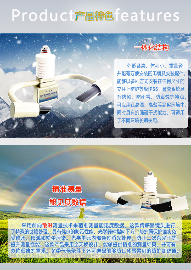 NJD-6型天氣現(xiàn)象能見度傳感器是錦州陽光自主研發(fā)的國產(chǎn)化高精度天氣現(xiàn)象探測設(shè)備,可以識別各種雨及雪的狀態(tài),超越了傳統(tǒng)的雨量儀器,滿足對雨雪的精密觀測,同時又可以實時監(jiān)測能見度的數(shù)據(jù)。