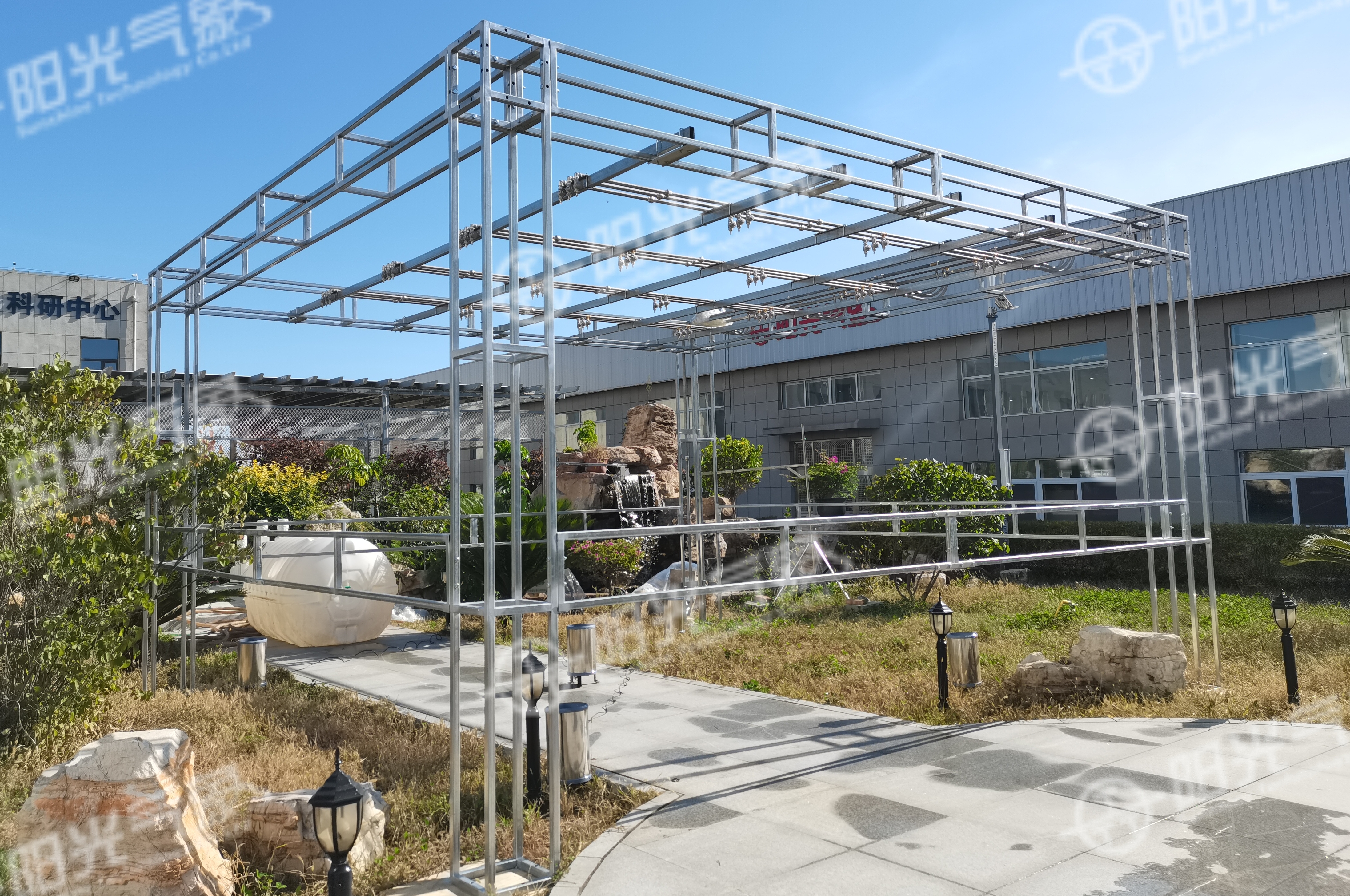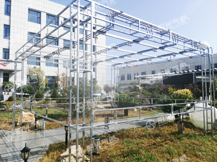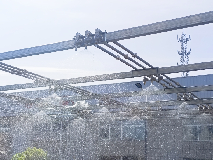 噴霧單元由供水管路、直管段、噴嘴、支架等組成,噴嘴采用專業(yè)模擬雨滴噴頭——旋轉(zhuǎn)下噴式噴嘴,不銹鋼材質(zhì),噴嘴和直管段集成在一起,噴霧支架為不銹鋼方管結(jié)構(gòu),用來架設(shè)供水管路和噴嘴。噴霧單元設(shè)計(jì)噴霧量為200~1000L/H,噴霧壓力0.5~3Bar,噴霧高度和覆蓋面積可按用戶需求進(jìn)行定制。